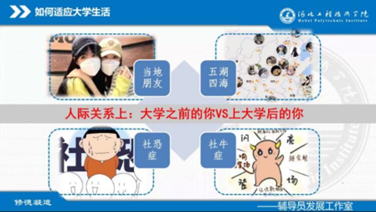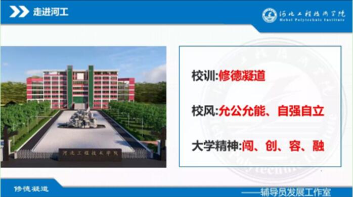 辅导员首先进行了详细的自我介绍,使同学们对辅导员有一个初印象。本次主题班会围绕“走进河工”“适应老员工活”“奋斗河工”三个模块开展。在走进河工的开始,辅导员先通过视频以及讲解让同学们了解了河工的校训、校风、大学精神,增强了同学们的知校爱校荣校意识。接着通过大学前生活和大学后生活的对比,使同学们了解到高中和大学在学习方式、人际交往等方面的不同之处。