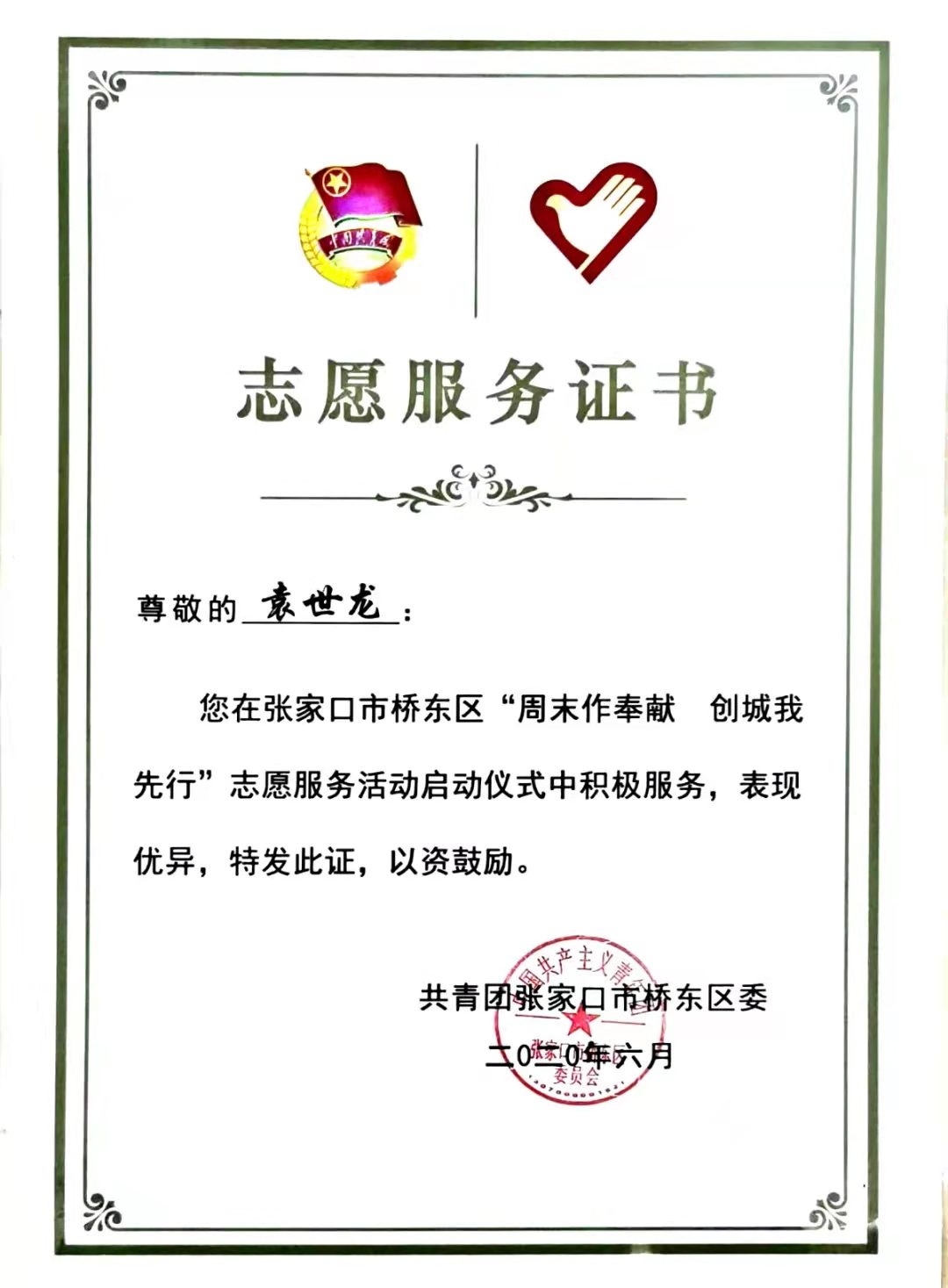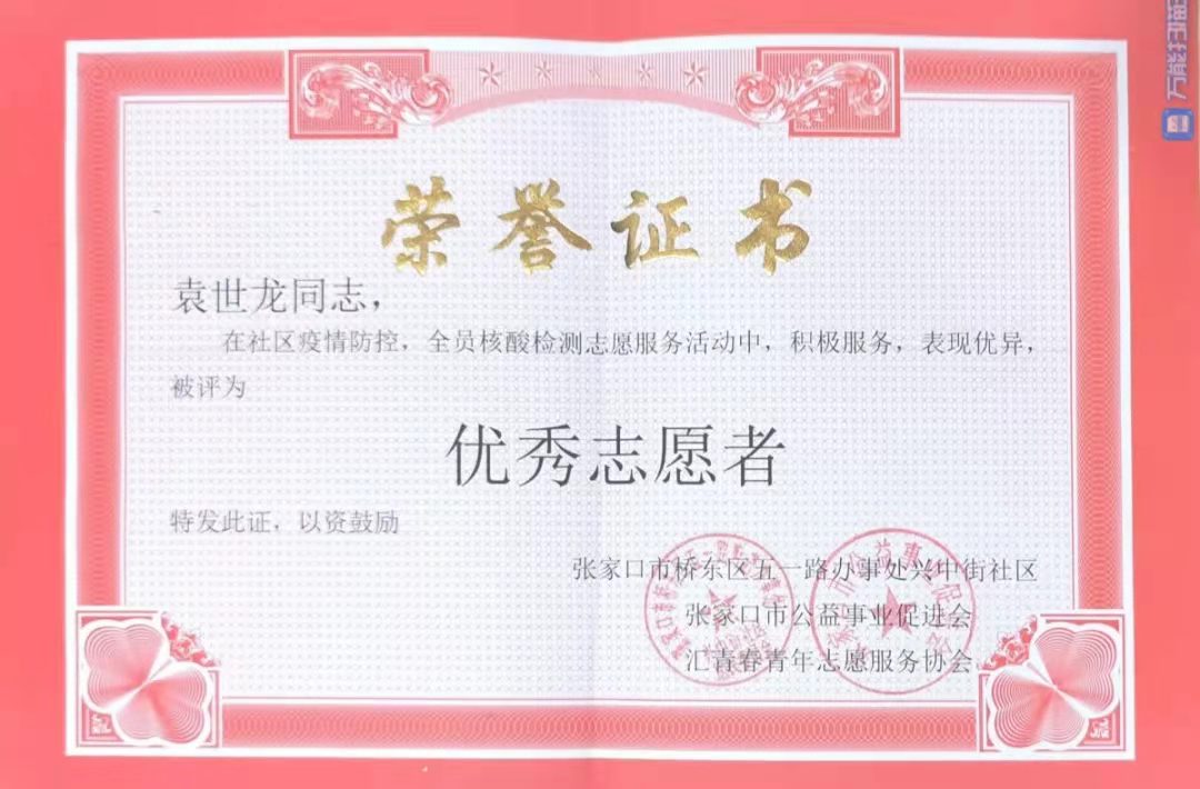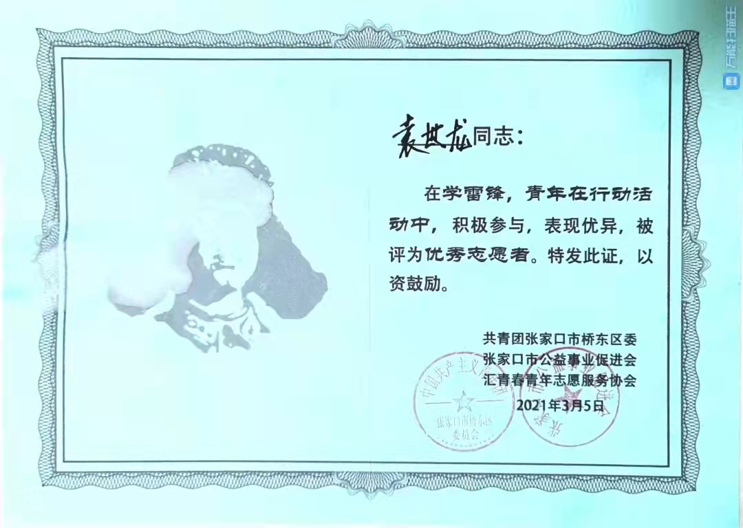 他在2019年参加张家口市桥东区“返家乡”社会实践活动,“周末做贡献 创城我先行”志愿服务活动启动仪式;2020年参加抗击新冠肺炎志愿服务活动,利用专业所学技能,创新性的协助社区开发制作了小区出入登记系统,受到了街道党工委的表彰;2021年继续参加社区各类志愿服务活动,协助数据汇总、入户排查、疫苗接种等系列志愿服务工作,被区委、区政府评为“抗疫先锋”个人称号。