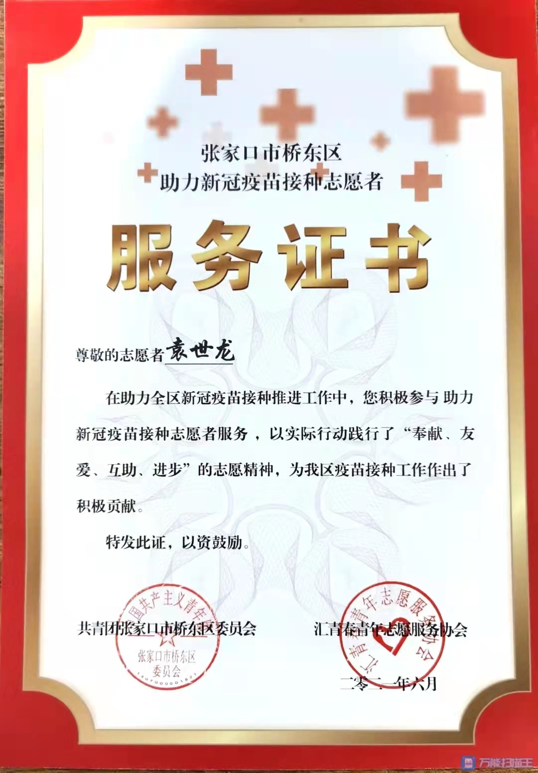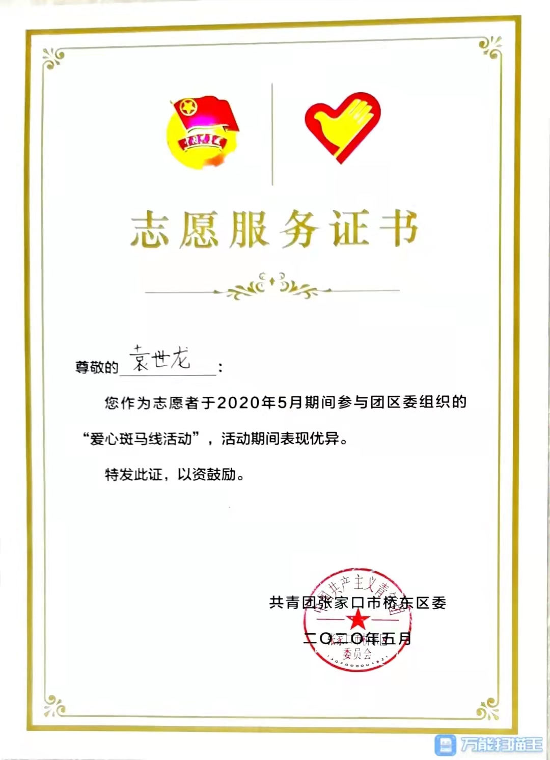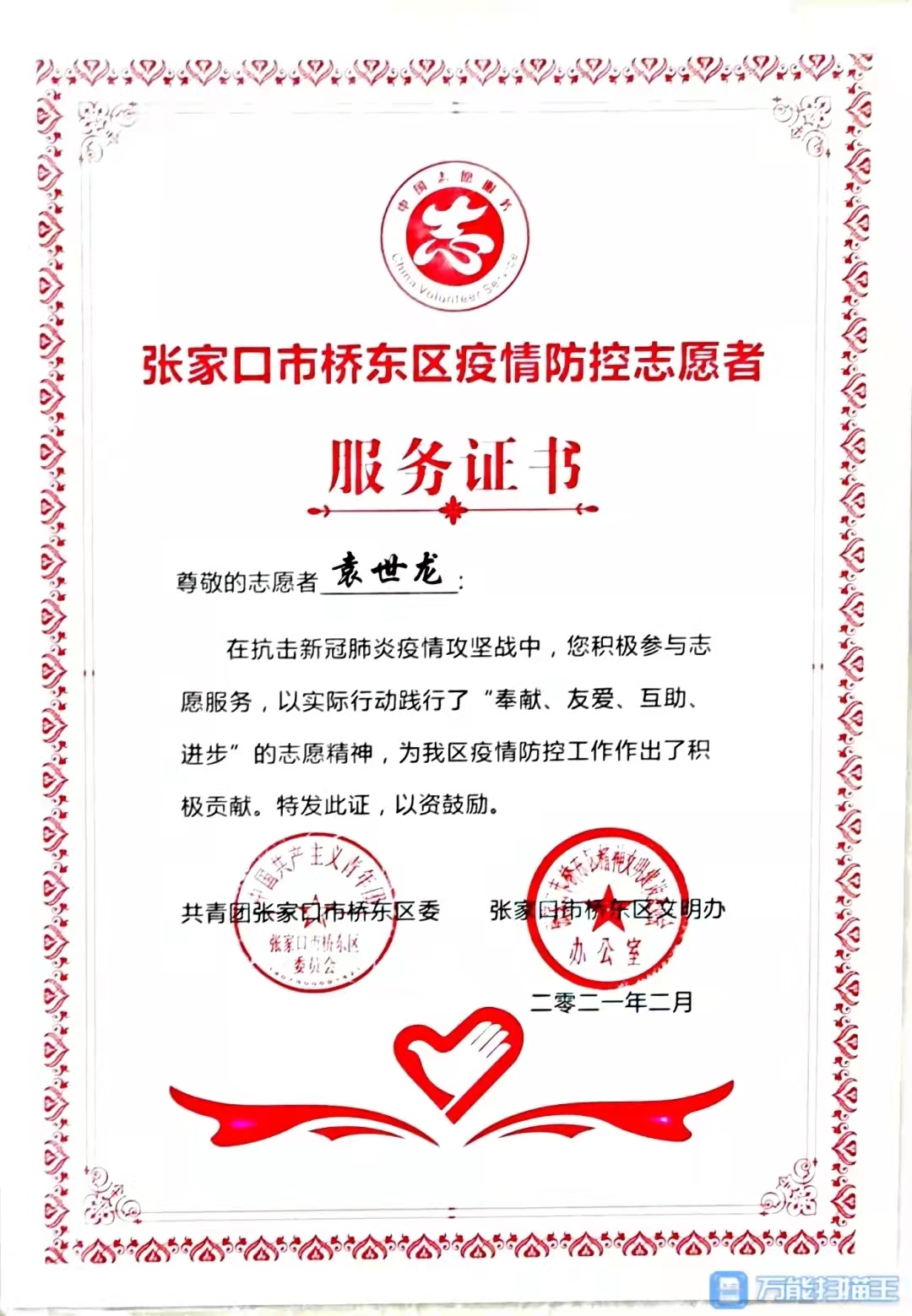 他在2019年参加张家口市桥东区“返家乡”社会实践活动,“周末做贡献 创城我先行”志愿服务活动启动仪式;2020年参加抗击新冠肺炎志愿服务活动,利用专业所学技能,创新性的协助社区开发制作了小区出入登记系统,受到了街道党工委的表彰;2021年继续参加社区各类志愿服务活动,协助数据汇总、入户排查、疫苗接种等系列志愿服务工作,被区委、区政府评为“抗疫先锋”个人称号。