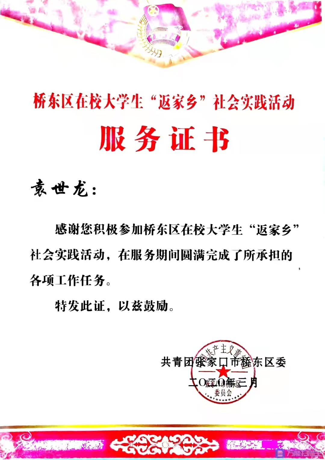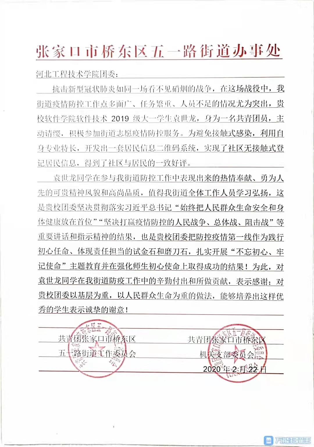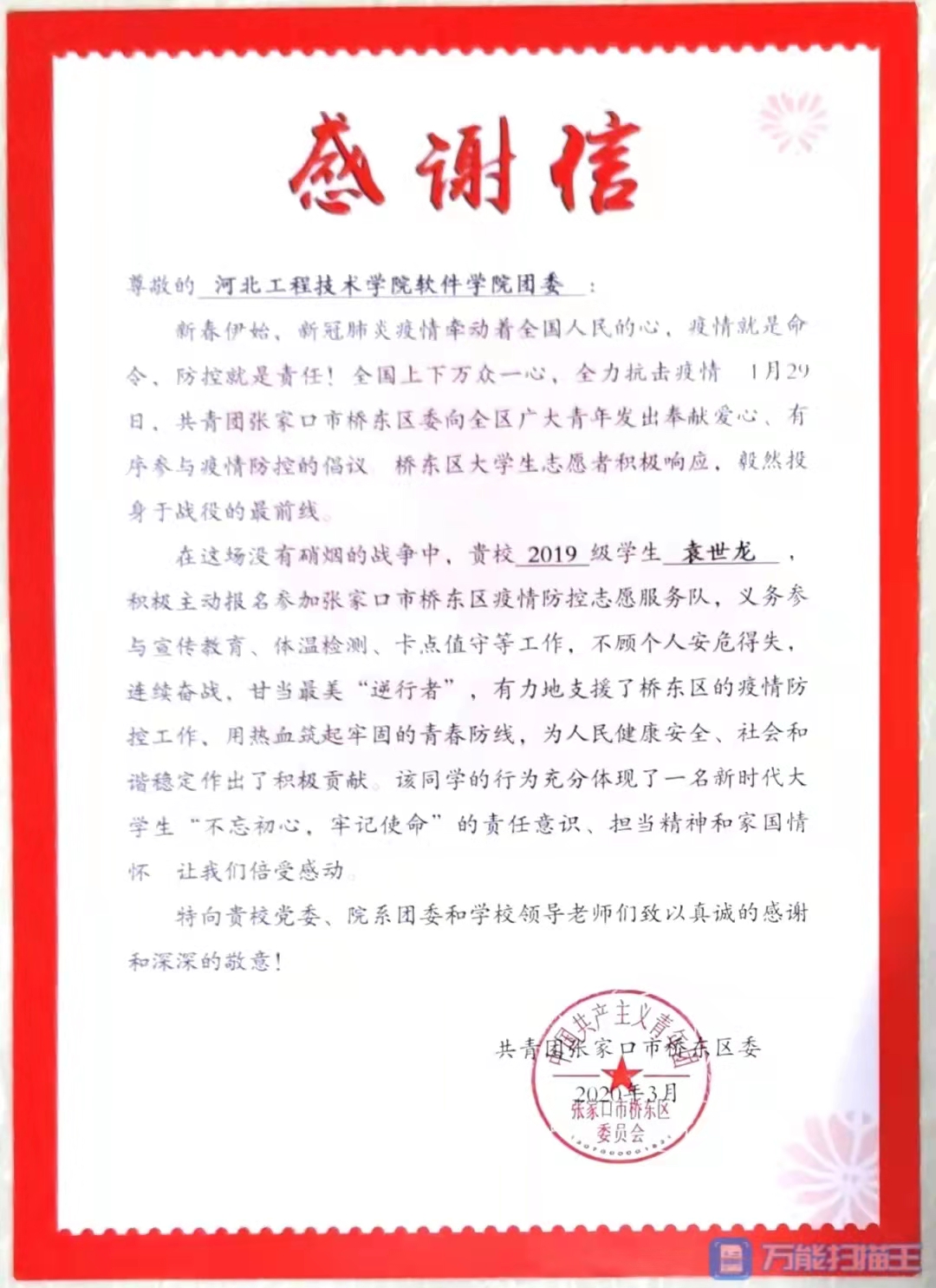 袁世龙,男,永利3044集团官网软件公司2019级软件技术专业员工。在校期间认真学习,积极参加公司组织的各类活动。在假期主动参加志愿服务活动,受到当地团委的表扬,并提供了共青团张家口市桥东区委工作岗位。