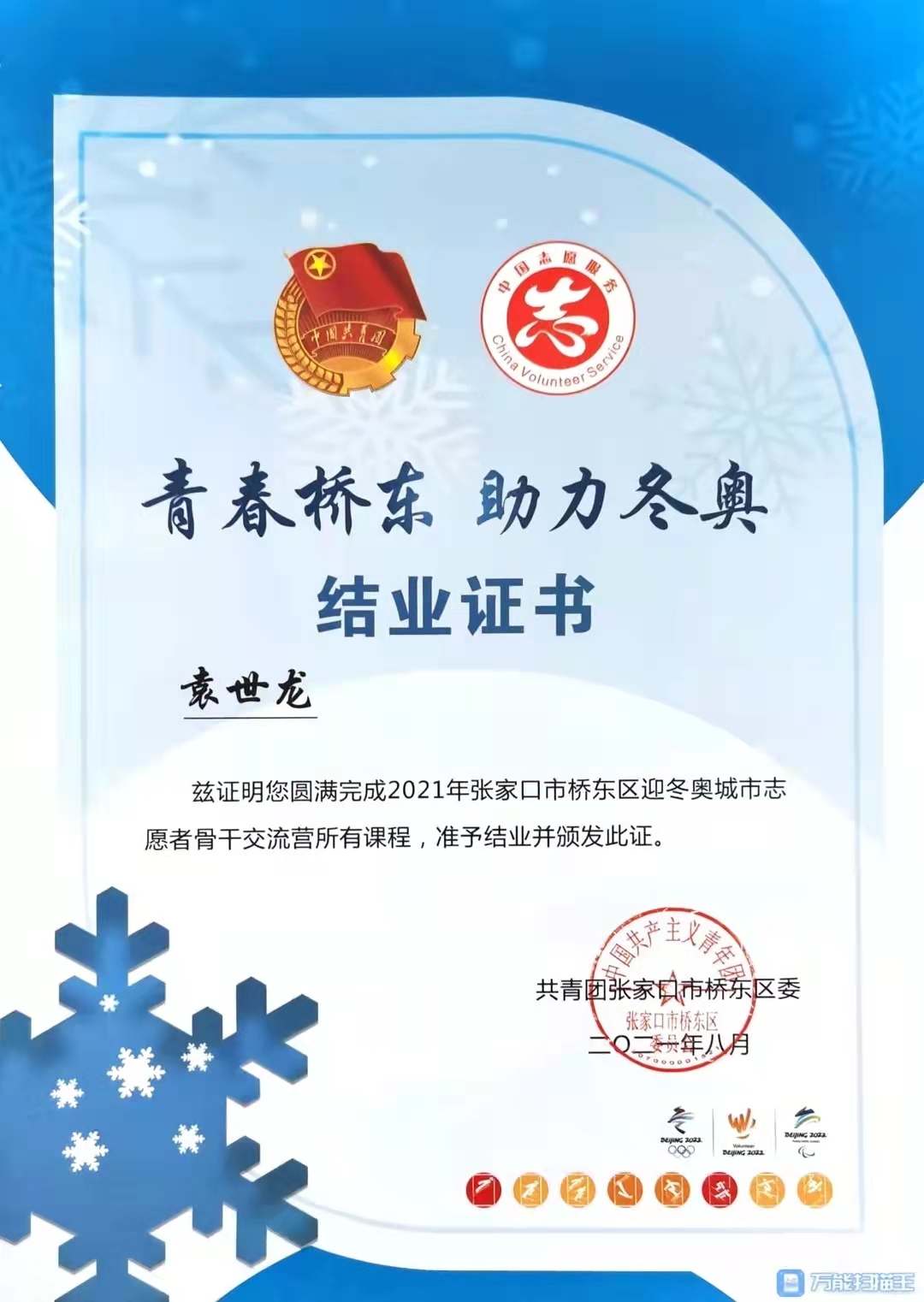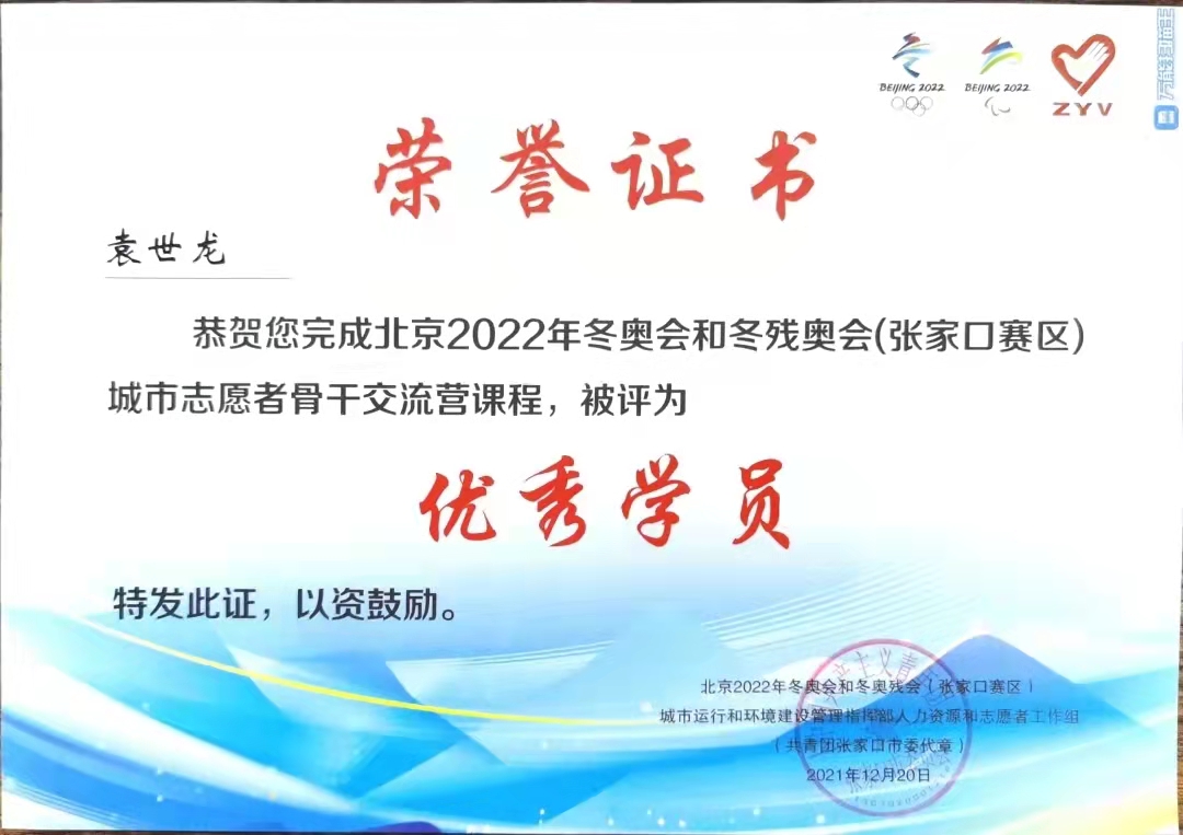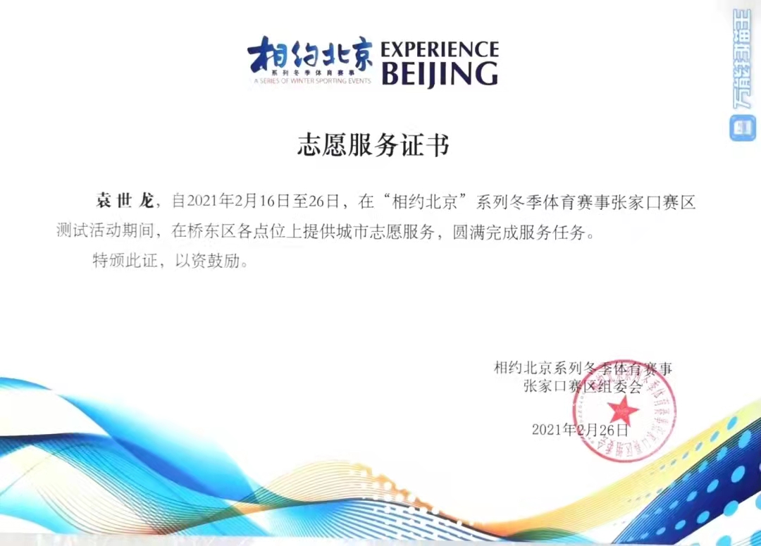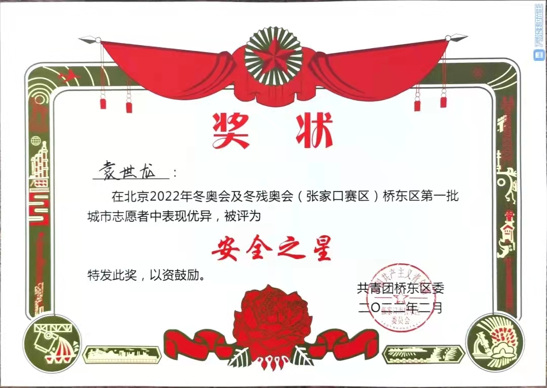 他负责志愿者保障、公众号撰写,视频号制作,利用软件专业特长,撰写公众号10余篇,视频1个,累计点击量达1.5万;在北京2022年冬奥会及冬残奥会期间,任桥东区调度中心综合协调组组长,同时过年期间协助共青团张家口市委制作拜年视频;作为桥东区“抗疫先锋”及骨干志愿者,参与观看了北京2022年冬奥会(张家口赛区)自由式滑雪的比赛及冬残奥会残奥冬季两项比赛。