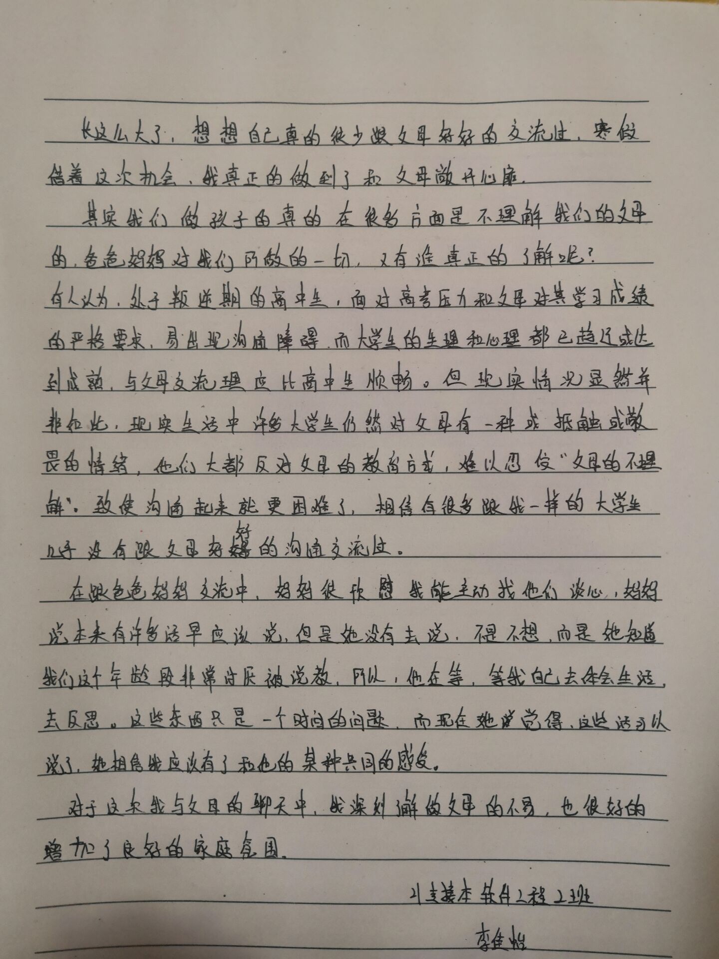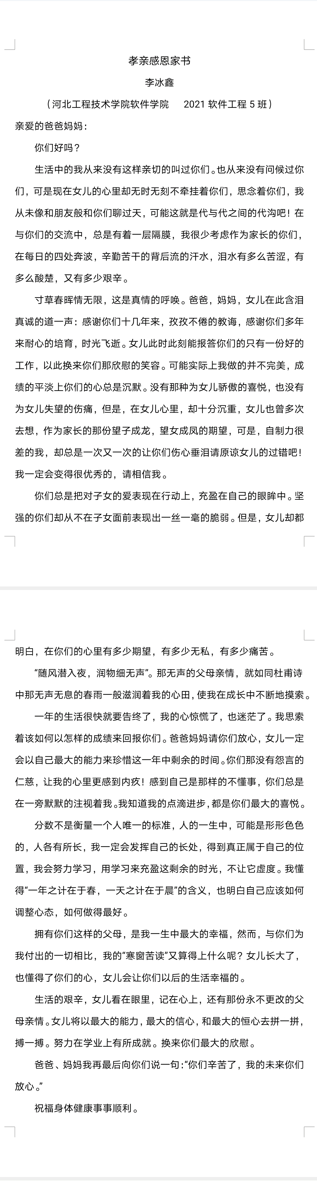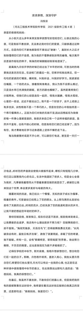 3.“爸,妈你们对我无私的恩情,我无法用笔记录下来,但是我一定铭记心中,永远不忘你们对我的恩情。我写不出优美感人的语言,但我拿起笔有千言万语要写下来。爸妈,辛苦了!”——21软件工程1班 高佳星