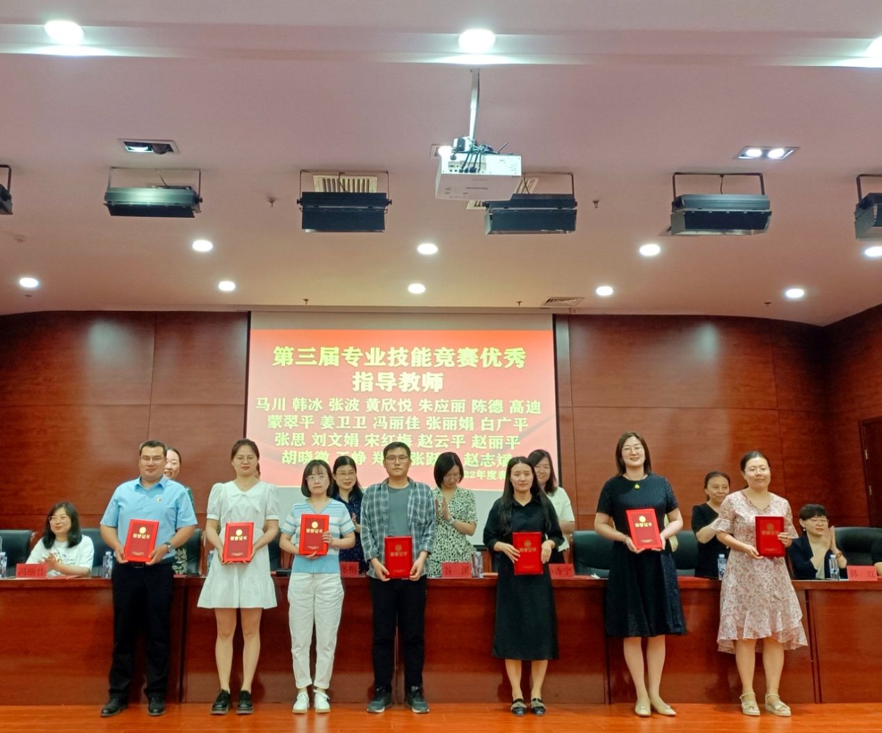 致辞结束后,颁奖典礼正式开始,首先为第一、二、三届软件公司专业技能竞赛获奖员工及专业技能竞赛优秀指导老师颁奖,软件公司专业技能竞赛赛项包括:软件设计比赛、网页设计比赛、平面设计比赛、“指间争霸”打字比赛、创新创业比赛、电商产品创意海报设计比赛、软件系统开发说明书比赛、软件测试比赛、网络安全知识竞赛、员工职业生涯规划比赛等等。专业技能比赛激发了员工的学习主动性和积极性,专业技能也得到了进一步提升。