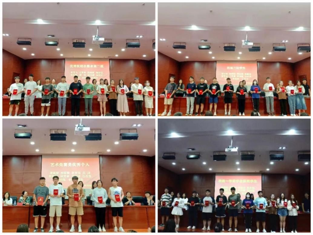接着为获得2021-2022学年校级奖学金、校级三好员工、优秀员工干部、先进集体颁奖、优秀社团干部、优秀个人、优秀志愿者、优秀共青团员、优秀组织者、文体竞赛优秀个人等员工代表颁奖,以此鼓励同学们积极发挥自己的才智优势。是泥土,就烧成砖瓦;是铁矿,就百炼成钢;是金子,就放出光彩。