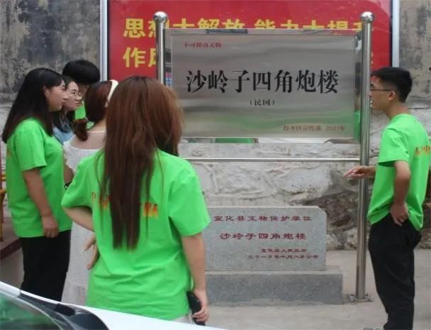 第一站我们来到了沙岭子村村委会。我们团队先是了解了沙岭子村村委会办公室前的四角炮楼。四角炮楼始建于1943年10月,重修于1998年9月。属于宣化县文物保护单位,1998年重修时将炮楼外围的四周围墙拆除,将炮楼保留,现在作为沙岭子村村委会办公用地。