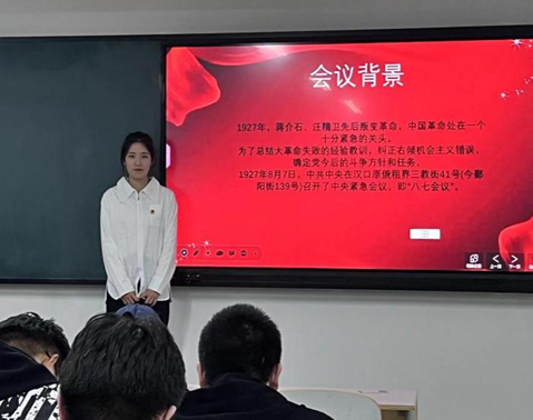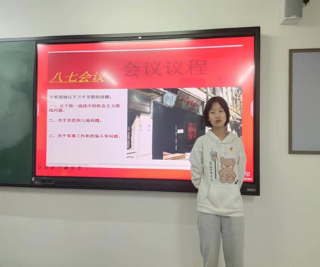 网络空间安全1班的王宣云同学和网络空间安全3班的马佳林同学主要介绍了八七会议的目的及参加会议的人员。这次会议的主要目的是总结大革命失败的经验教训,确定今后革命斗争的方针。出席会议的有李维汉、瞿秋白、张太雷、邓中夏、任弼时、顾顺章、蔡和森、毛泽东、陆定一、王一飞等21人。参加会议的还有中共中央秘书处处长邓小平。共产国际代表罗明纳兹和两名俄国同志也出席会议。
