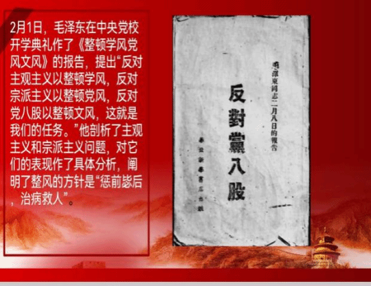 22级网络空间安全三班的曹思瑜同学则按照时间线介绍了毛主席做出的贡献:2月1日,毛泽东在中央党校开学典礼作了《整顿学风党风文风》的报告,提出“反对主观主义以整顿学风,反对宗派主义以整顿党风,反对党八股以整顿文风,这就是我们的任务。”2月8日,毛泽东在延安干部会上作《反对党八股》的报告,明确指出党八股是主观主义和宗派主义的一种表现形式,并列举了党八股的八大罪状,把文风提到了党风的高度,使人耳目一新。软件工程一班的严少东同学介绍了进行延安整风的任务:反对主观主义。软件工程二班的李佳鑫同学则讲解了延安整风的历史意义。
