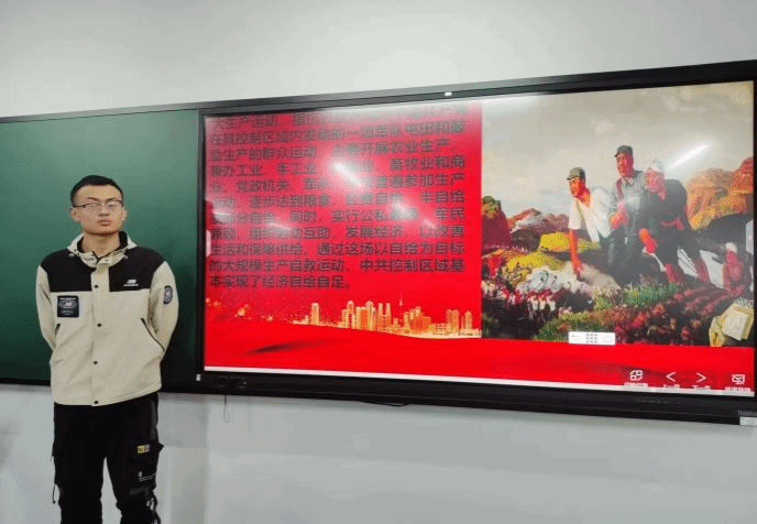 22软件工程一班的王懿珂同学向同学们介绍了中七大举办的时间及参会人员:在抗日战争即将取得胜利的前夜,1945年4月23日至6月11日,中国共产党第七次全国代表大会在延安召开。出席七大的代表共755名,其中正式代表547名,候补代表208名,代表全党121万党员,分为中直(包括军直系统)、西北、晋绥、晋察冀、晋冀鲁豫、山东、华中和大后方8个代表团。在七大代表中,年龄最大的近70岁,最小的才20岁左右。