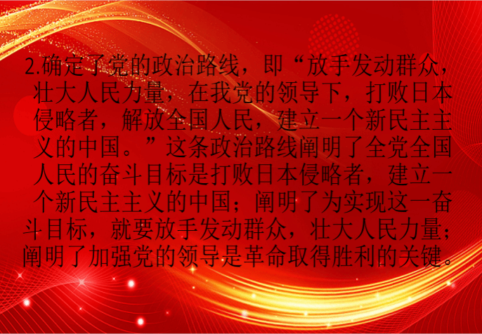 22网络空间安全二班的杨嘉悦同学主要介绍了中共七大的历史贡献:七大是中国共产党在新民主主义革命时期极其重要的一次、也是最后一次代表大会。它总结中国新民主主义革命20多年曲折发展的历史经验,制定了正确的路线、纲领和策略,克服了党内的错误思想,使全党特别是党的高级干部对于中国民主革命的发展规律有了比较明确的认识,从而使全党在马克思列宁主义、毛泽东思想的基础上达到了空前的团结。这次大会作为“团结的大会、胜利的大会”而载入史册。它为党领导人民去争取抗日战争的胜利和新民主主义革命在全国的胜利,奠定了政治上、思想上和组织上的深厚基础。党的七大另一个重大历史性贡献是将毛泽东思想写在了党的旗帜上,确立毛泽东思想为党的指导思想并写入党章。