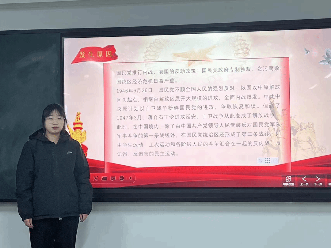 2022级软件工程三班的刘永辉向同学们详细介绍了这一系列战役的过程:全面内战爆发之后,毛泽东从延安的枣园搬到了中央军委的所在地——王家坪,在这里指挥着全国的自卫战争。全面内战刚爆发时,面对国民党军队绝对优势的兵力和火力,毛泽东提出的战略战术是强调集中优势兵力,各个歼灭敌人,以消灭敌人有生力量为主,不以保守城市和地方为主。全面内战爆发半年之后,国民党军队攻占了解放军区105座城市,但是,它却有70个旅的兵力被歼灭,机动兵力越打越少,全面进攻变得困难。因此,1947年春天,国民党军队就改为重点进攻,集中进攻陕北和山东。1947年元旦,蒋介石向师以上的部队,发布了一个第70号密令,提出在一年之内彻底消灭万恶之奸匪,却没想到发布命令不久,自己在山东遭到了最大的一次歼灭。