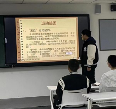 软工5班的吴佳超同学则侧重于三反五反运动的重要意义。三反五反运动有力地抵制了资产阶级腐朽思想对革命队伍的腐蚀,清除了干部队伍中的蜕化变质分子,教育和挽救了一批干部,提高了干部和广大人民的社会主义觉悟,增强了对资产阶级腐蚀的抵抗力,并在社会上树立了廉洁朴素的社会风尚。同学们积极踊跃地参加活动,发表了激情四射的演讲。几位同学认真地准备PPT,演讲稿,在台上认真地将三反五反运动知识传输给同学们。如下图所示: