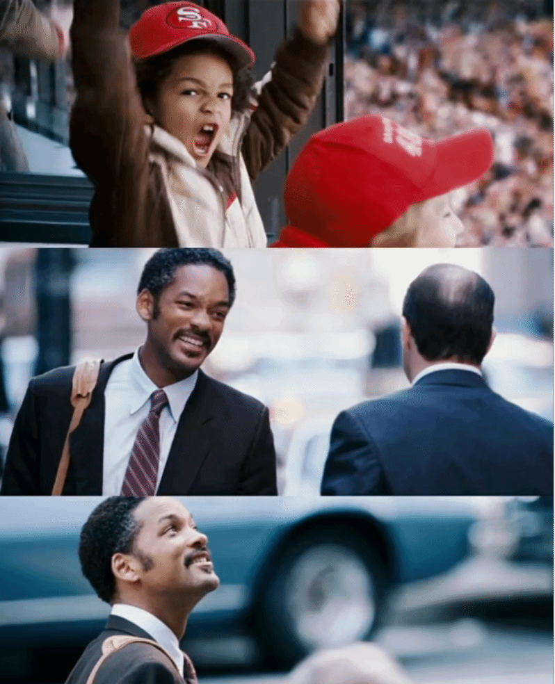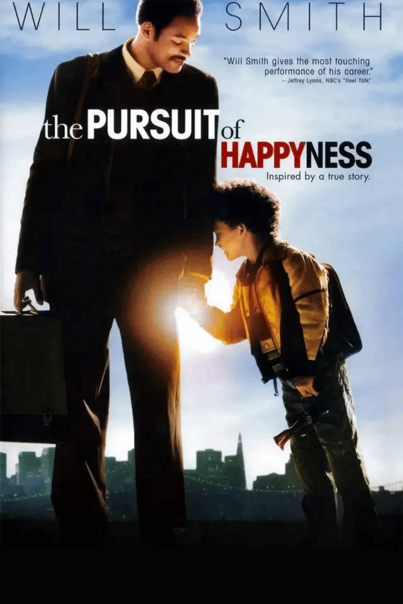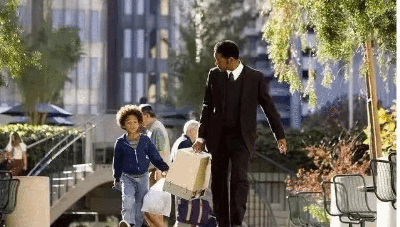 电影主人公克里斯·加德纳是一名医疗器械推销员,由于这个医疗器械的价格过于昂贵,很难售卖出去,导致家里经济条件越来越差,妻子琳达因无法忍受如此艰苦的生活离他而去,他一个人带着儿子,一边准备证券公司的考试,一边继续售卖扫描仪以维持生计。可命运就是如此多坎,本以为生活暂时平稳了,可税收却把他几乎全部身家拿走了,他被房东赶出门,睡过收容所,睡过地铁的公共厕所,因追击偷扫描仪的人被车撞,更为如此艰苦的生活流过泪。生活的穷困让他沮丧无比,可为了儿子的幸福,也为了自己的未来,他凭着自己的努力成功了。