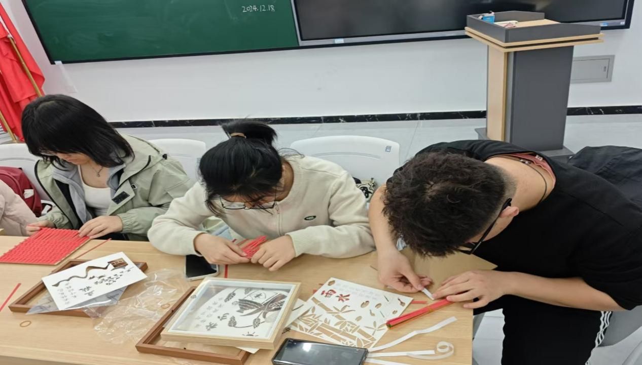 冬至是二十四节气之一。2006年5月20日,“二十四节气”作为民俗项目经国务院批准列入第一批国家级非物质文化遗产名录。2016年11月30日,中国“二十四节气”被正式列入联合国教育、科学及文化组织人类非物质文化遗产代表作名录。走进活动现场,竹条的清新气息弥漫在空气中,同学们围坐在一起,全神贯注地投入到竹编画创作中。桌上摆放着粗细不一、色泽温润的竹条,以及各种精巧的编织工具。