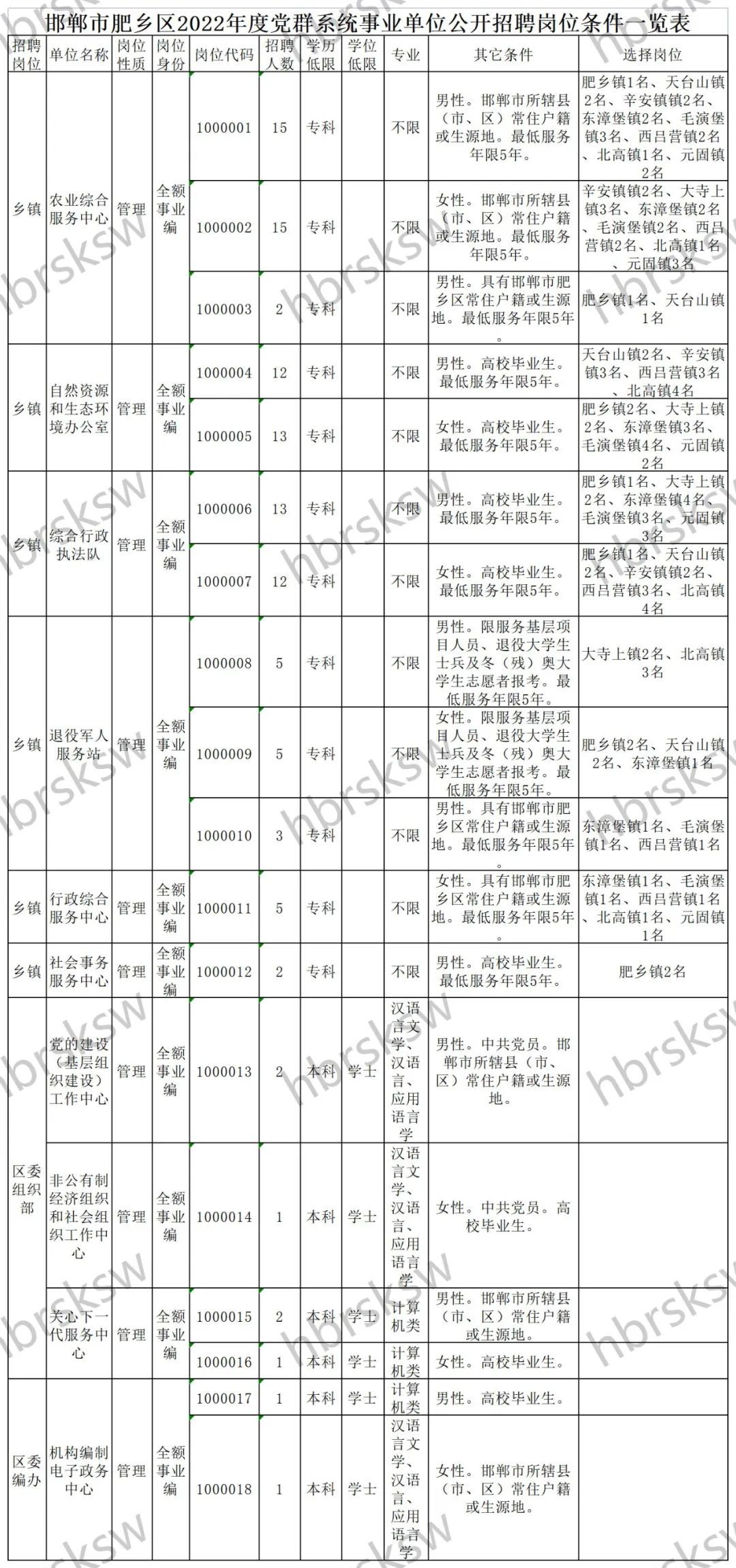 附件:邯郸市肥乡区2022年度党群系统事业单位公开招聘岗位条件一览表
