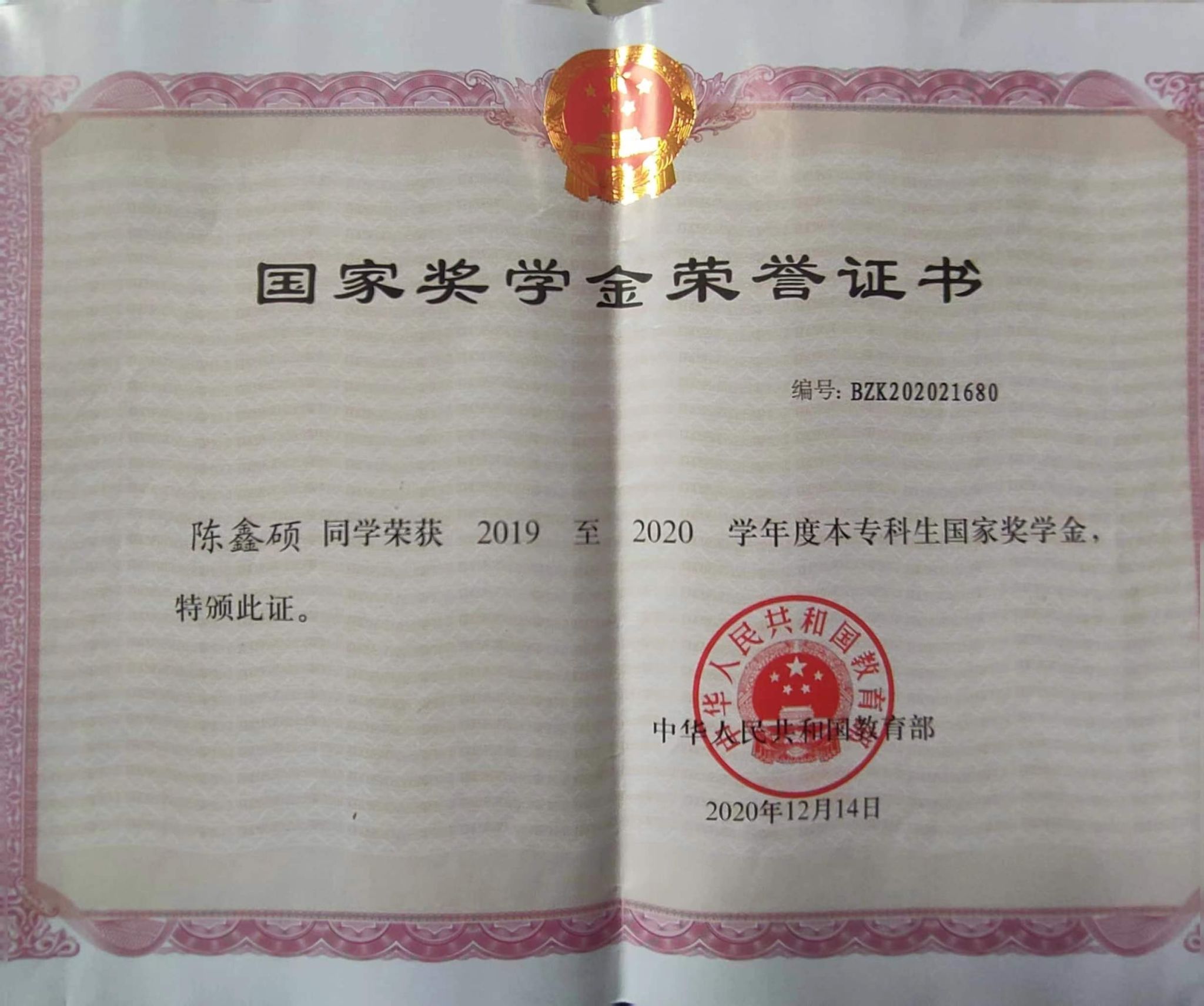 2020年12月获国家奖学金