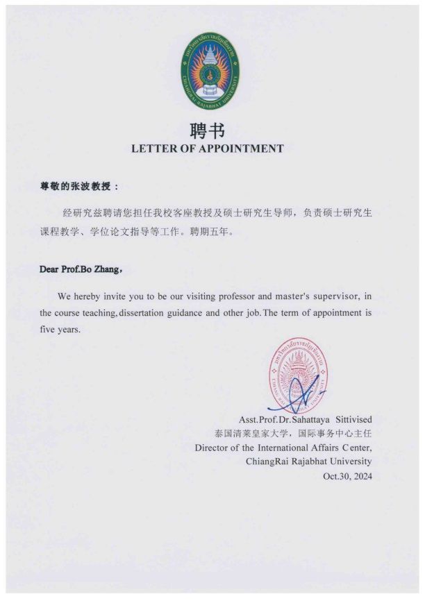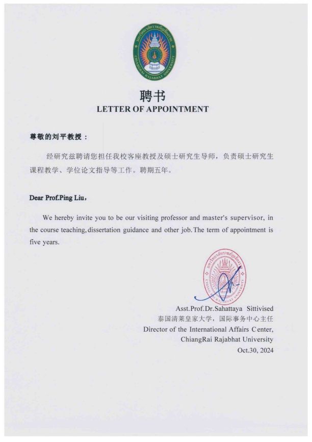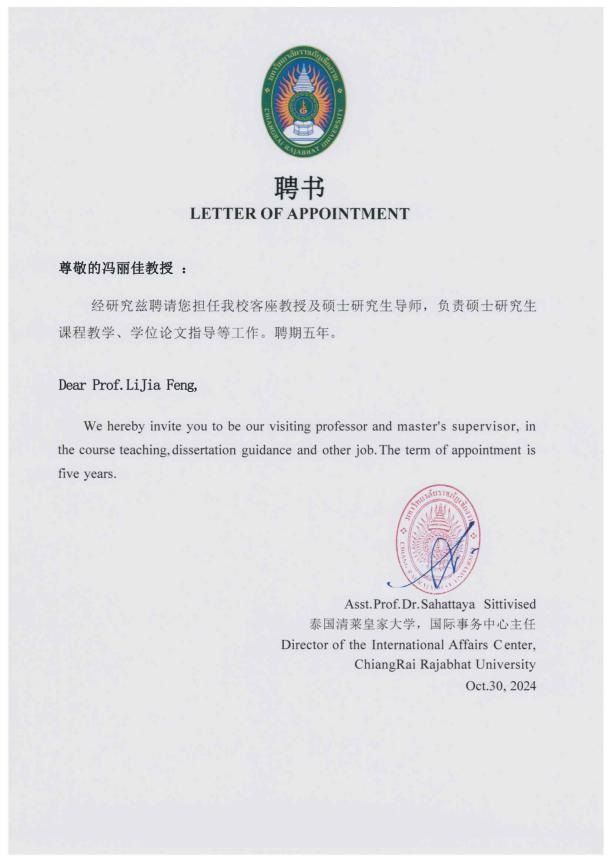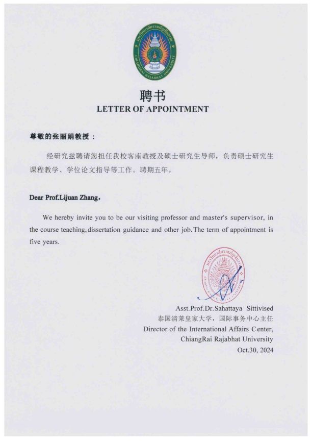 为积极响应国家共建“一带一路”教育行动的号召,深化公司国际交流与合作的战略部署,推动高水平教育对外开放,公司与泰国清莱皇家大学共同设立“硕士研究生联合培养中心”。经教师个人申请、各教学单位初审、校领导复审、泰国清莱皇家大学评议,2024年10月30日起,公司张波、冯丽佳、张丽娟、刘平4名教师被聘任泰国清莱皇家大学硕士研究生导师,聘期五年。