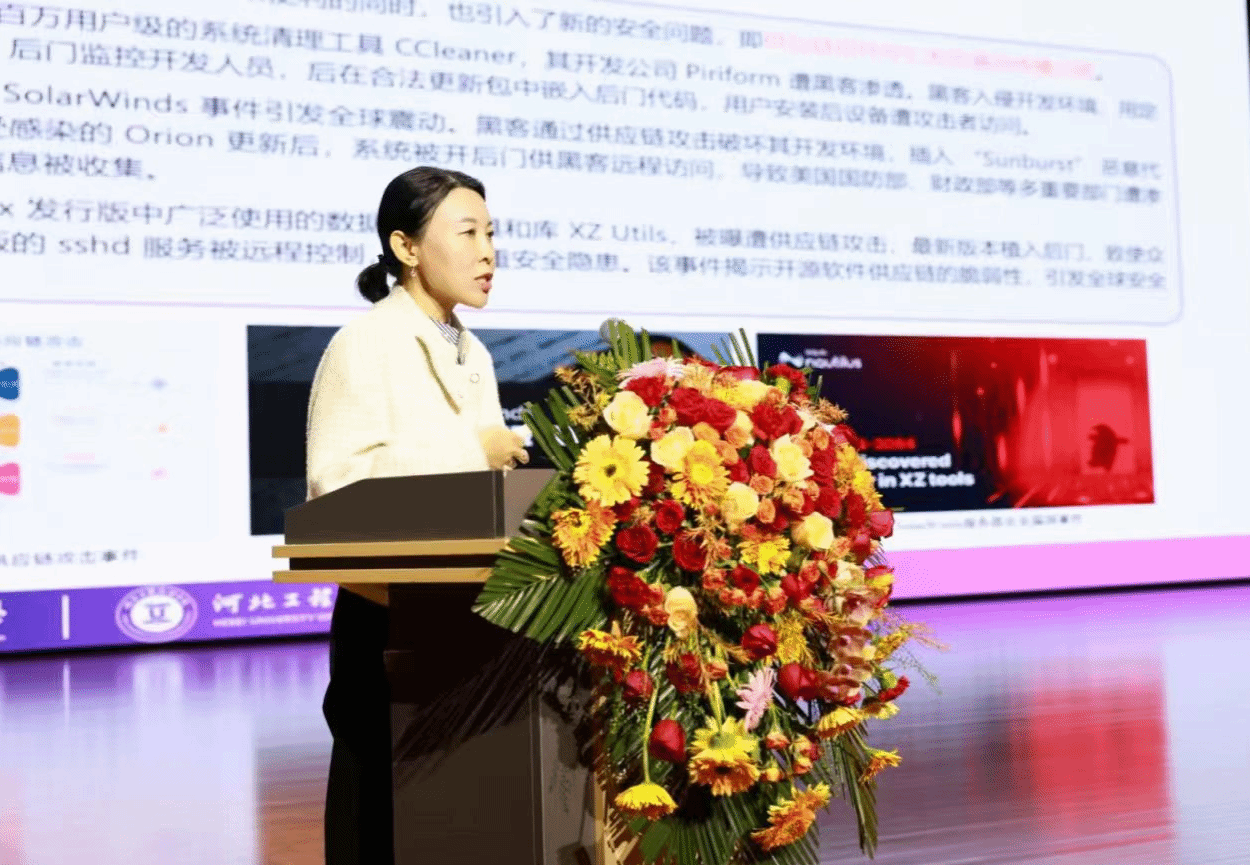 讲座伊始,张波副经理代表公司对邢颖副教授的到来表示热烈欢迎,并详细介绍了其学术背景与研究成就。张波副经理指出,邢颖副教授作为CCF高级会员、博士生导师、国家自然科学基金同行评议专家及行业学术论坛核心组织者,长期深耕软件工程与智能安全领域,成果丰硕。她强调,在AI技术快速迭代的背景下,安全知识图谱已成为网络威胁感知、风险预警的核心支撑,其自动构建与推理技术的研究具有重要学术价值和产业应用前景,希望通过此次讲座为教师搭建学术交流平台,助力教学科研工作提质增效。