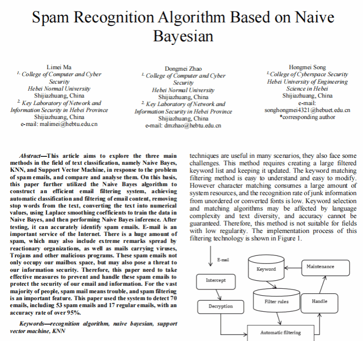 针对这一痛点,宋红梅老师团队开展基于朴素贝叶斯算法的垃圾邮件识别研究。团队通过优化特征提取、引入TF-IDF文本表征技术,扩大样本规模并优化模型参数,显著提升了算法识别准确率与泛化能力。实验显示,该算法识别准确率超87%,处理多类型、变异垃圾邮件时稳定性更优。