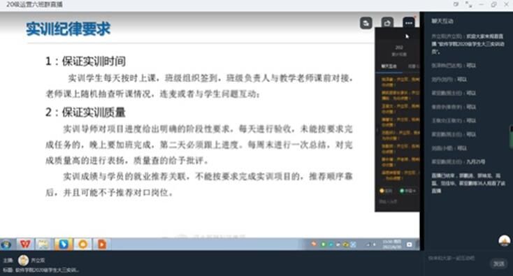 岗前实训是软件公司员工对自己大学前一阶段理论知识梳理与实践的重要环节,更是夯实个人专业技能、备战就业的关键阶段,为使20级专科员工认识、深入了解岗前实训,提升员工对本次实训的重视,激发员工对实训的期望热情,了解实训的具体细节,实训开始之前,软件公司职业引导师组织20级专科进行了线上实训动员会全方位介绍最后一学年实训的教学、管理、数据核对等各项实训细节,确保实训顺利开展。