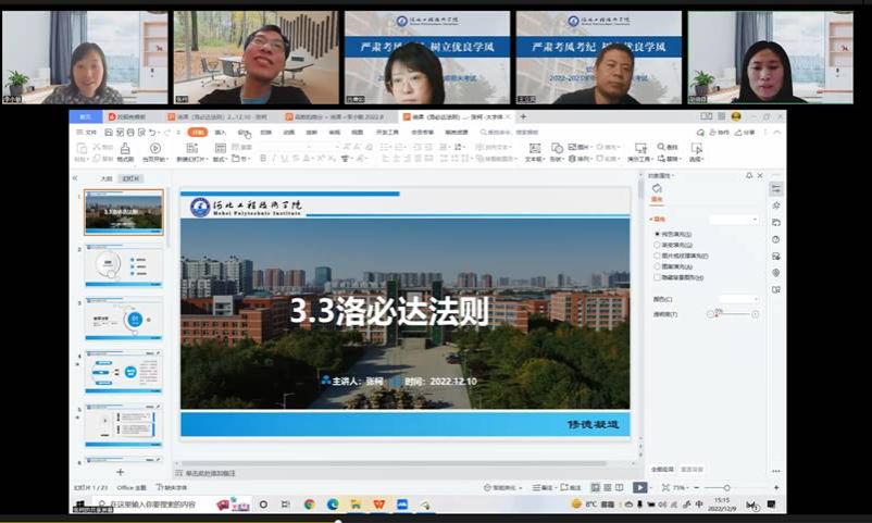 再次,进行课程思政汇报与分享,创新创业教研室胡晓微、通识教研室赵晓辉、张倩、吕倩如四位老师依次对《创新创业》、《高等数学》、《大学英语1》及《高等数学》课程从教学内容、教学组织、教学过程及课程思政元素、课程思政内容设计及方法等方面进行了“课程思政”讲课分享。
