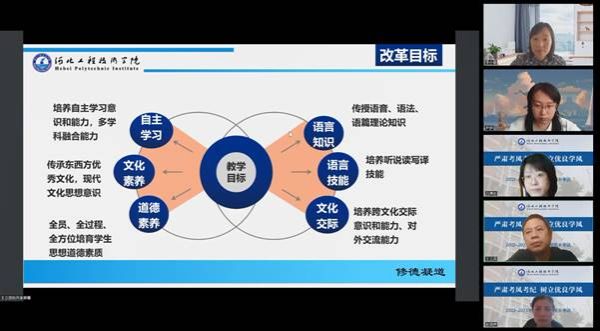 其次,进行说课汇报与分享,通识教研室刘亚芳、张柯、杨晓叶三位老师依次对《大学英语3》、《高等数学》、《大学英语1》课程从教学目标与内容、教学设计、教学方法及教学过程等方面进行了课程“说课”分享。
