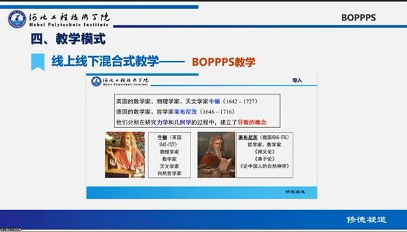 首先,进行课程教学创新汇报与分享。创新创业教研室尹伊、通识教研室李小敏、通识教研室王立宾,三位老师依次对《创新创业》、《高等数学》、《大学英语》课程从教学理念、教学内容、教学模式及教学效果等方面进行了课程“教学创新”分享。