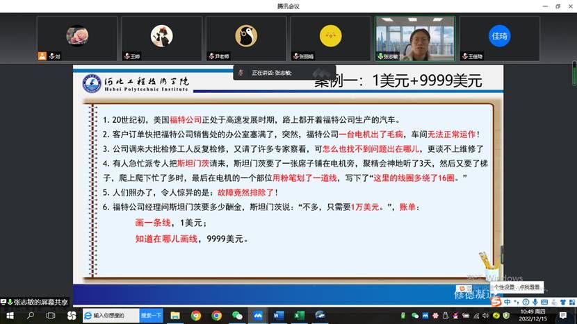 软件公司于12月15日上午举办公司课程思政教学比赛,本次比赛由各个基层教学组织推荐的8为老师参赛,有的老师带病坚持参赛。参赛教师有通识课教师,专业课教师,各位教师都展示了自己在教学中如何将思政元素潜移默化的融入教学中,鼓励员工树立正确的价值观,培养员工团队意识,精益求精的精神等等。